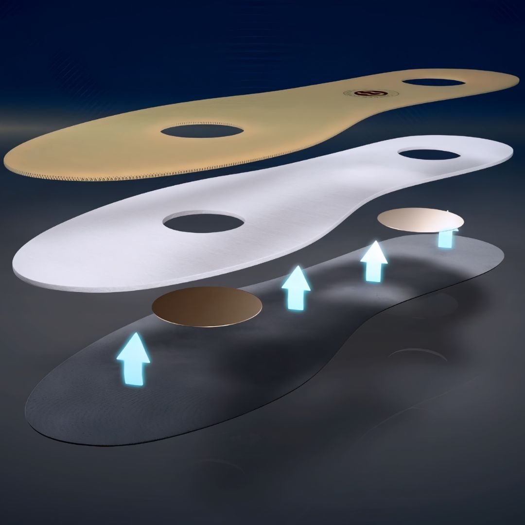 Naši ulošci s trostrukim slojem kombiniraju tri funkcionalna sloja i dva bakrena diska za maksimalnu udobnost i podršku. Zahvaljujući tankom i fleksibilnom dizajnu, savršeno pristaju u sve vrste obuće. Bakar – prirodni mineral poznat po svojoj izdržljivosti i postojanosti – ugrađen je u uloške kako bi pružio dodatnu udobnost i svježinu pri svakom koraku.