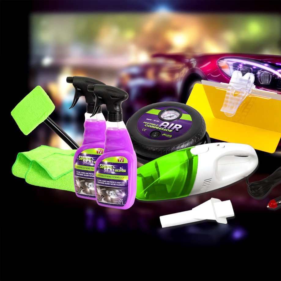 Set Sadrži: 2 x Shine & Seal sredstvo za zaštitu automobila (2 x 500 ml), 2x krpa od mikrovlakana, 1x pribor za čišćenje stakla, 1x prozirni vizir, 1x Turbo Car usisavač, 1x prijenosni kompresor na zrak