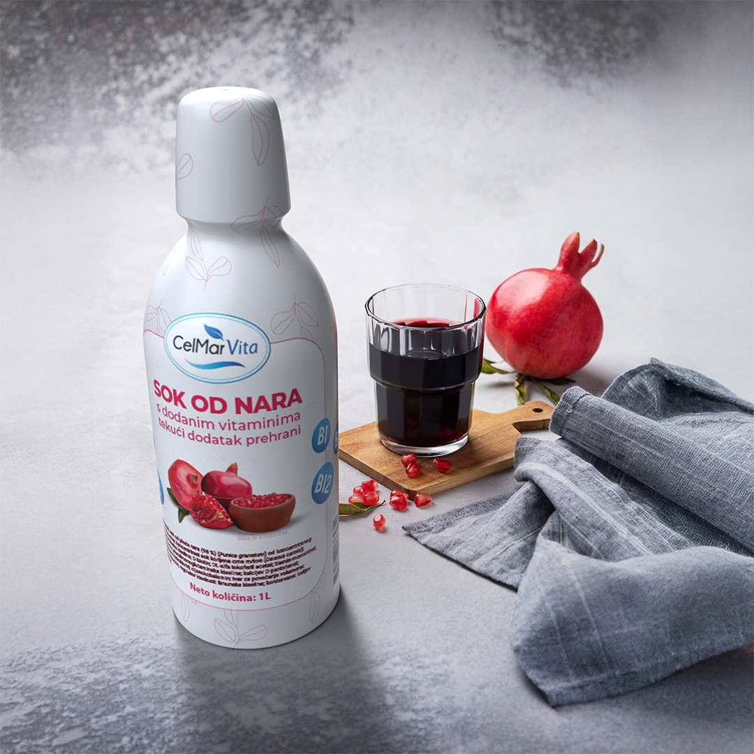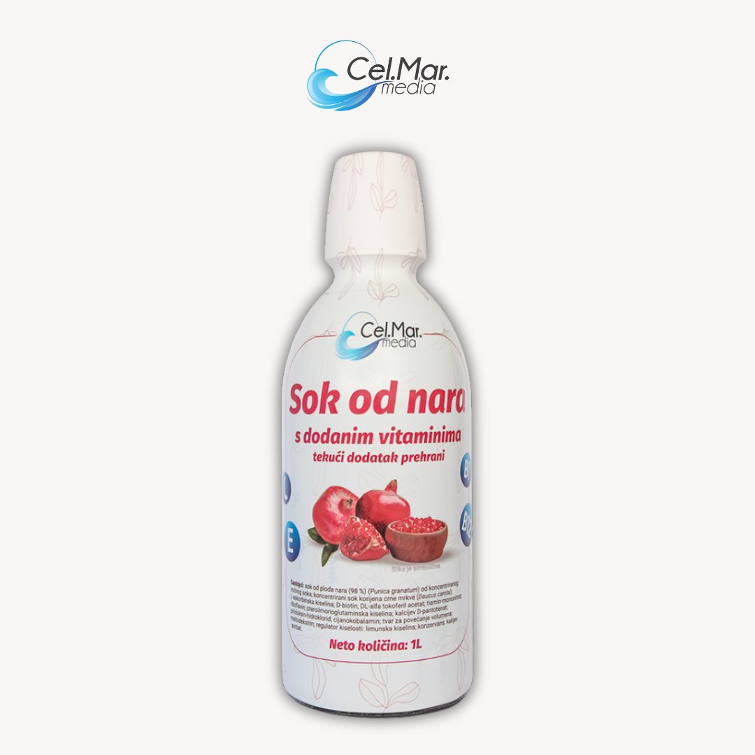 Sastojci: sok od ploda nara (98 %) (Punica granatum) od koncentriranog vocnog soka; koncentrirani sok korijena crne mrkve (Daucus carota); L-askorbinska kiselina; D-biotin; DL-alfa tokoferil acetat; tiamin-mononitrat; riboavin; pteroilmonoglutaminska kiselina; kalcijev D-pantotenat; piridoksin-hidroklorid; cijanokobalamin; tvar za povecanje volumena: maltodekstrin; regulator kiselosti: limunska kiselina; konzervans: kalijev sorbat.