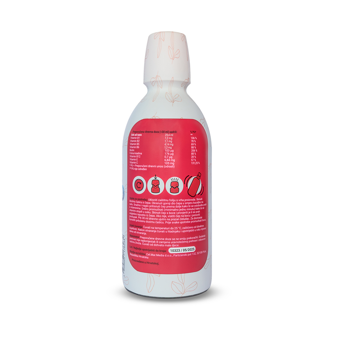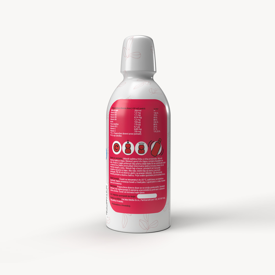 Upute za upotrebu: Ukloniti zaštitnu foliju s vrha proizvoda. Skinuti dozirnu čašicu s čepa. Okrenuti gornji dio čepa u smjeru kazaljke na satu. Snažno i naglo pritisnuti čep prema dolje kako bi se oslobodio prah s vitaminima te dobro promućkati (minimalno jednu minutu) kako bi se vitamini otopili u soku. Skinuti čep s boce i provjeriti je li se prah uspješno ispustio iz čepa. Ako nije, vratiti čep na bocu i ponoviti postupak. Piti 30 ml dnevno ujutro na prazan želudac. Za doziranje koristiti priloženu dozirnu čašicu. Prije svake upotrebe promućkati bocu.